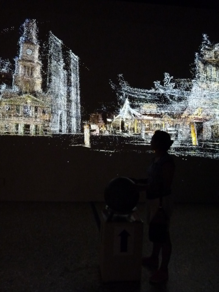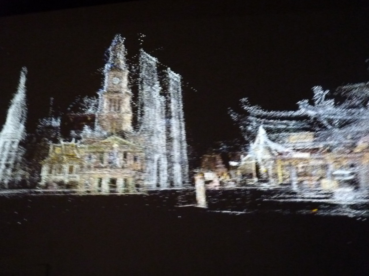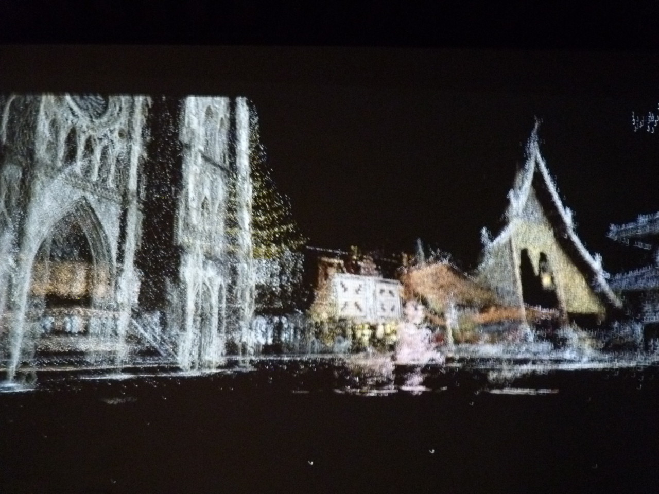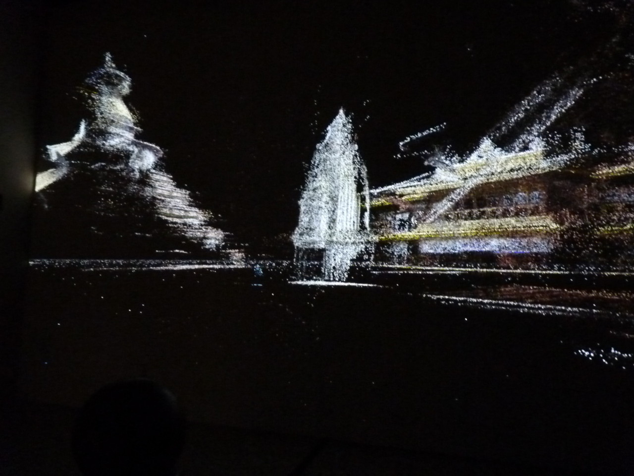 Destaco especialmente o trabalho “Exploded Views 2.0” de Marnix de Nijs, uma instalação interactiva em que o visitante navega fisicamente através de uma paisagem citadina audiovisual constituída por nuvens de pontos e criada com uma técnica em 3D que cria uma atmosfera surreal e onírica. Interessante, engenhoso e divertido, e quase viciante.